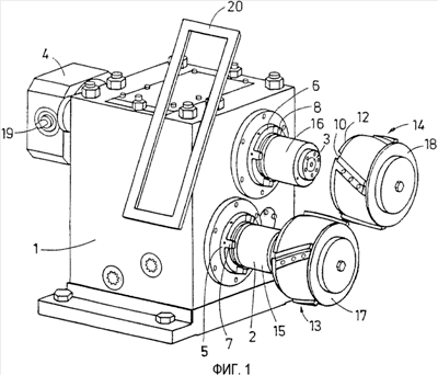 Фиг.1 показывает кромкообрезное устройство 1 с нижним, фиксированным ножевым валом 2, а также верхним, аксиально смещаемым ножевым валом 3. Ножевой вал 3 может регулироваться, аксиально смещаясь, посредством устройства 4 регулировки ножевого зазора. На ножевых валах 2, 3 расположены упорные кольца 5, 6. Упорные кольца 5, 6 имеют захваты 7, 8, которые могут вставляться в ответные захватам элементы 9, 10 юстировочных колец 11, 12 ножевых головок 13, 14. На ножевых валах 2, 3 расположены гидравлические зажимные элементы 15, 16. Ножевые головки 13, 14 могут закрепляться на ножевых валах 2, 3, кроме как посредством гидравлических зажимных элементов 15, 16, также с помощью концевых дисков 17, 18.