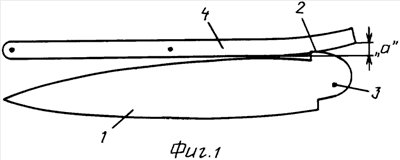 Лезвие 1 (фиг.1) выполнено с закругленным концом, на котором имеются выступ 2 и отверстие 3 для оси, с помощью которой лезвие 1 шарнирно крепится (не показано). Отверстие 3 смещено перпендикулярно продольной оси лезвия. Конец пружины 4 контактирует в закрытом, нерабочем положении лезвия с выступом 2, а в открытом, рабочем положении – с закругленным концом лезвия 1. Противоположный конец и средняя часть пружины 4 жестко закреплены штифтами на рукояти (не показано).