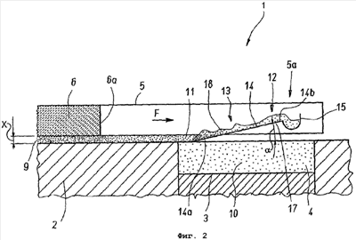 Удаляющее средство предпочтительно содержит пластинообразное средство, которое содержит и предпочтительно выполнено в виде скребкового средства, имеющего наклонную плоскость, образующую угол, который составляет существенно меньше 90°, с плоской поверхностью скольжения указанного пластинообразного средства, при этом указанное пластинообразное средство имеет конец, который соприкасается с указанной плоской поверхностью скольжения с возможностью захвата и удерживания на нем материала, образующего избыточную часть.