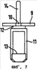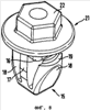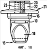 На фиг.8-11 показана имеющее иное исполнение соединительная система, которая также состоит из двух поворачиваемых друг относительно друга деталей и изготавливаемая тем же способом, что и описанный выше. В данном случае анкерная деталь 15 состоит из прямоугольной пластинчатой головки 16, от которой вниз выступает плоский шип 17. От конца этого шипа 17 в направлении пластинчатой головки 16 отходят две расходящиеся лапки 18. На свободном конце каждой из лапок 18 предусмотрено по уступу 19. С верхней стороны пластинчатой головки 16 на ней по ее центру выполнен короткий штырь 20 с наружной резьбой (см. также фиг.12). На этот штырь 20 надет навинчиваемый на него, имеющий центральное глухое отверстие 23 с внутренней резьбой колпачок 21 с поворотной ручкой 22.