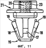 На фиг.12 на примере трех отдельных изображений проиллюстрирован процесс соединения двух деталей с использованием такой соединительной системы. Сначала в соответствии с первым изображением друг с другом совмещают сквозные соединительные отверстия 25 двух скрепляемых между собой пластинчатых деталей 24. В показанном на этом чертеже особом случае верхняя деталь в последующем должна оставаться подвижной в боковом направлении относительно нижней детали, в связи с чем соединительное отверстие 25 в верхней детали выполнено в виде прорези. Соединительную систему уже в собранном виде, в котором ее получают при ее изготовлении описанным выше способом, вставляют сверху в обозначенном стрелкой направлении в соединительные отверстия 25 и проталкивают в них до упора пластинчатой головки 16 в поверхность верхней из скрепляемых между собой деталей. При этом отходящие от конца шипа 17 лапки 18 сначала упруго сгибаются навстречу друг другу, а после прохождения через соединительные отверстия 25 вновь разжимаются, заходя снизу своими уступами 19 под нижнюю деталь 24, как это показано на втором изображении. В особом случае колпачок 21 прилегает при этом своим краем к продольным краям прорези, в виде которой выполнено соединительное отверстие 25 в верхней детали 24. Для окончательной затяжки соединения необходимо повернуть колпачок 21. При выполнении пластинчатой головки 16 соединительной системы прямоугольной формы ее боковые поверхности в предпочтительном варианте могут служить направляющими в выполненном в виде прорези соединительном отверстии 25 при возможном боковом перемещении верхней детали.