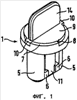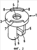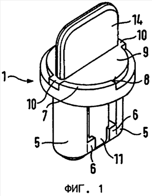 Как показано на фиг.1, в собранном состоянии анкерной детали 1 и стержневидной детали 2 ее стержень 11 располагается между лапками 5 анкерной детали 1, а пластина 9 прилегает к дисковидной головке 3. Круглая шейка 12 располагается в круглом отверстии 4. В таком собранном состоянии стержневидную деталь 2 можно с помощью поворотной ручки 14 поворачивать в одно из двух, повернутых друг относительно друга на 90° положений. Угол поворота стержневидной детали в обоих направлениях ограничивается упором выступающих с боков из стержневидной детали 2 ограничителей 10 в упоры 8, образованные концевыми поверхностями имеющих форму кольцевых сегментов бортиков 7 анкерной детали 1. В одном из указанных положений, которое можно обозначить как исходное положение, стержень 11 своими боковыми уступами 13 опирается на выступы 6 лапок 5, а узкая сторона его ступенчатого конца практически полностью перекрывает промежуток между обращенными друг к другу выступами 6 лапок 5. При повороте стержневидной детали 2 в отверстии 4 анкерной детали 1 на 90° широкая сторона ступенчатого конца стержня оказывается между выступами 6 лапок 5, которые в результате отжимаются во взаимно противоположные стороны.
