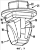 Такую соединительную систему также изготавливают описанным выше способом. Сначала в форме отливают анкерную деталь 15 и после ее затвердевания поверх, соответственно вокруг штыря 20 отливают колпачок 21, для которого штырь 20 с наружной резьбой выполняет при этом функцию литейного стержня и в котором тем самым автоматически образуется глухое отверстие 23 с внутренней резьбой. Анкерную деталь 15 и колпачок 21 и в этом случае отливают из двух различных полимерных материалов, не слипающихся между собой и обеспечивающих тем самым возможность поворота колпачка 21 на штыре 20. Используемый для изготовления анкерной детали 15 полимерный материал должен при этом допускать возможность упругого сгибания обеих отходящих от конца шипа 17 лапок 18. Анкерную деталь 15 и колпачок 21 изготавливают не в виде отдельных деталей, которые необходимо свинчивать друг с другом, а и в этом случае сразу изготавливают описанным выше способом в виде готового узла, образующего предлагаемую в изобретении соединительную систему.