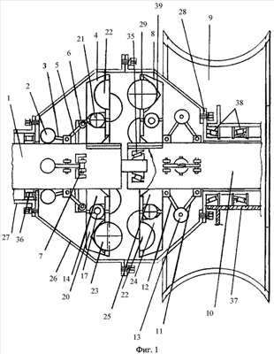 Ведущая и ведомая полуоси 1 и 10 содержат шлицы, на которых подвижно сопряжены ведущая 4 и ведомая 8 полумуфты, составленные из ведущей 14 и ведомой 25 ступиц и концентрично расположенных на них каретках 20 и 24. В торцевых частях кареток выполнены сферические выемки (лунки) 22 и арочные гнезда 39, где расположены стыковочные шарики 23, заблокированные сепараторами 29, жестко соединенными с корпусами кареток болтами с потайной головкой 30 (фиг.2). Каретки 20 и 24 подвижно соединены со ступицами 14 и 25 посредством одиночных шариков 21, расположенных в лотках 31, ограниченных лопастями 15 ступиц и лопастями 19 кареток. Поочередно с лотками в каретках и ступицах выполнены совмещенные пазы 32, в которых расположены пружины 17, одетые на упоры 33. Шарики, пружины и упоры закрыты кольцевыми крышками 34, закрепленными в корпусах ступиц болтами 30 с потайной головкой. Ведущая 1 и ведомая 10 полуоси соединены опорным подшипником 35 и шарнирно соединены с полумуфтами 4 и 8 рычагами 3 и 5 центробежных регуляторов с маховиками 2 и 13 и рычагами 11 и 12, при чем шарнирный маховик 13 расположен между рычагами 11 и 12, а рычаг 5 имеет Т-образный вид, на котором размещен ролик 7, расположенный в желобке 6 ведущей полумуфты 4. Ведущая полуразгруженная полуось 1 внешним концом опирается на подшипник 36, а ведомая полностью разгруженная полуось 10 соединена со ступицей 37, установленной на двух конических роликоподшипниках 38, размещенных на цапфе 28.