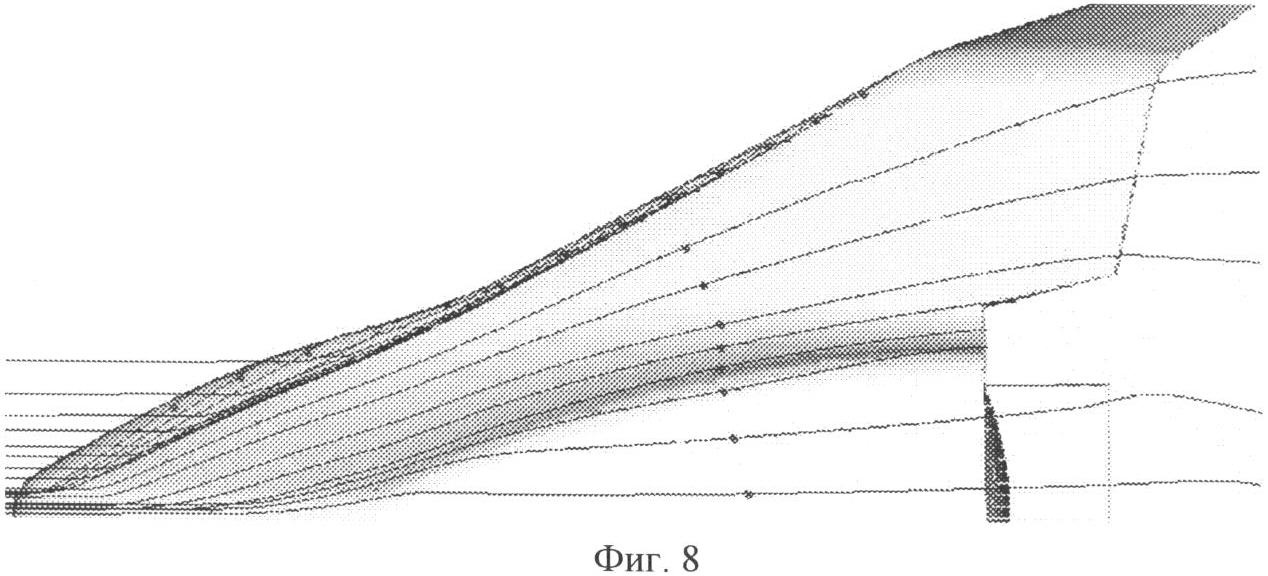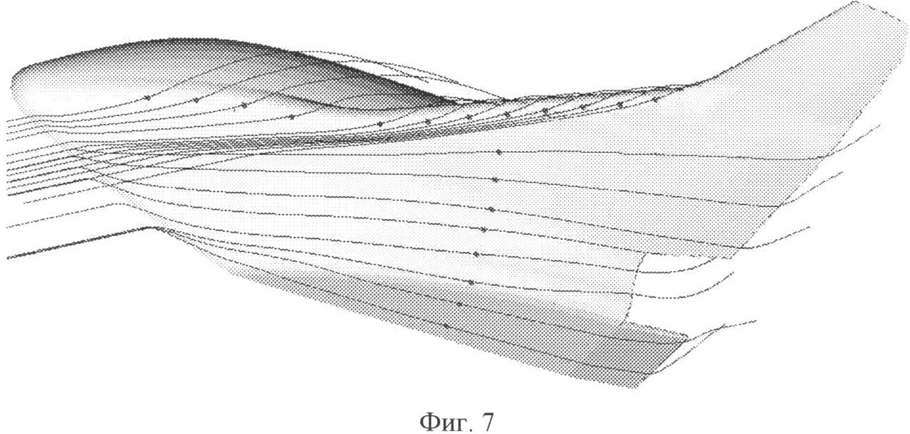 На фиг.7 для гиперзвуковых скоростей полета иллюстрируется картина обтекания КА с выделением линий тока на его поверхности, а на фиг.8 – обтекание нижней поверхности стреловидного крыла.