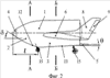 – по каналу крена также кормовым щитком 5 и элевонами 7 стреловидного крыла 6 при отклонении щитка и элевонов, работающих в режиме элеронов, в разные стороны;