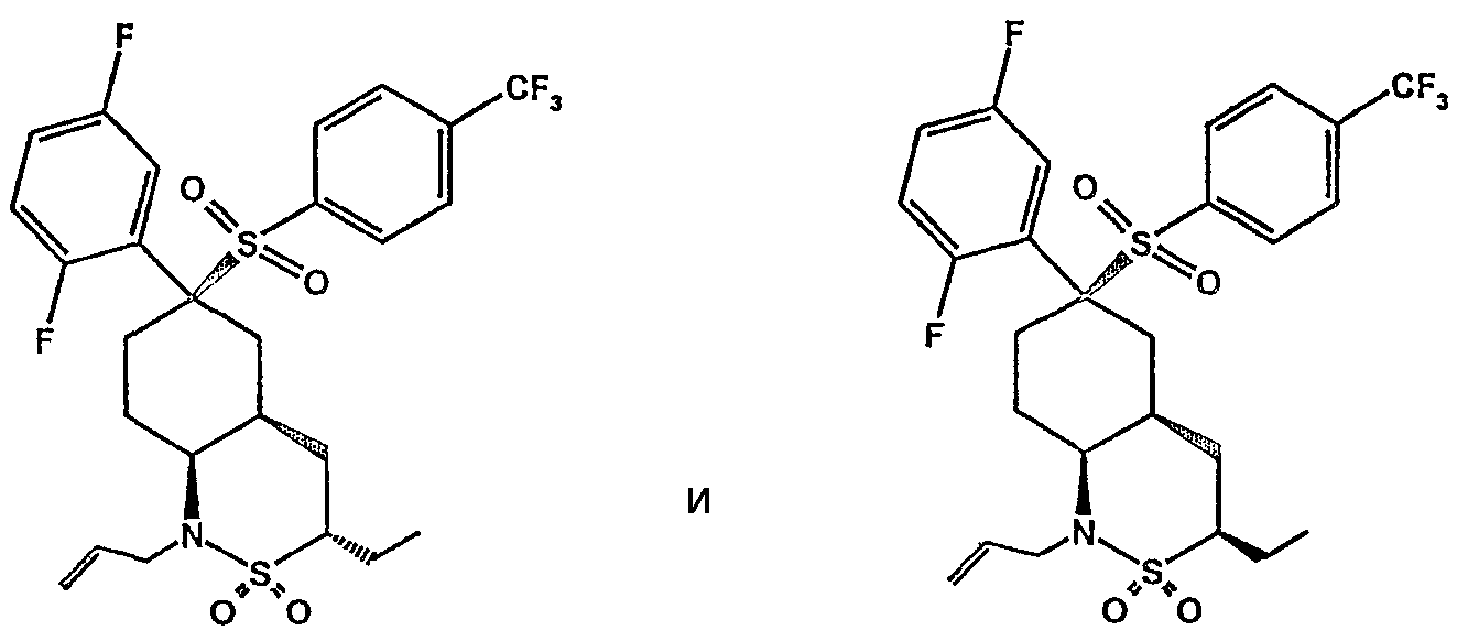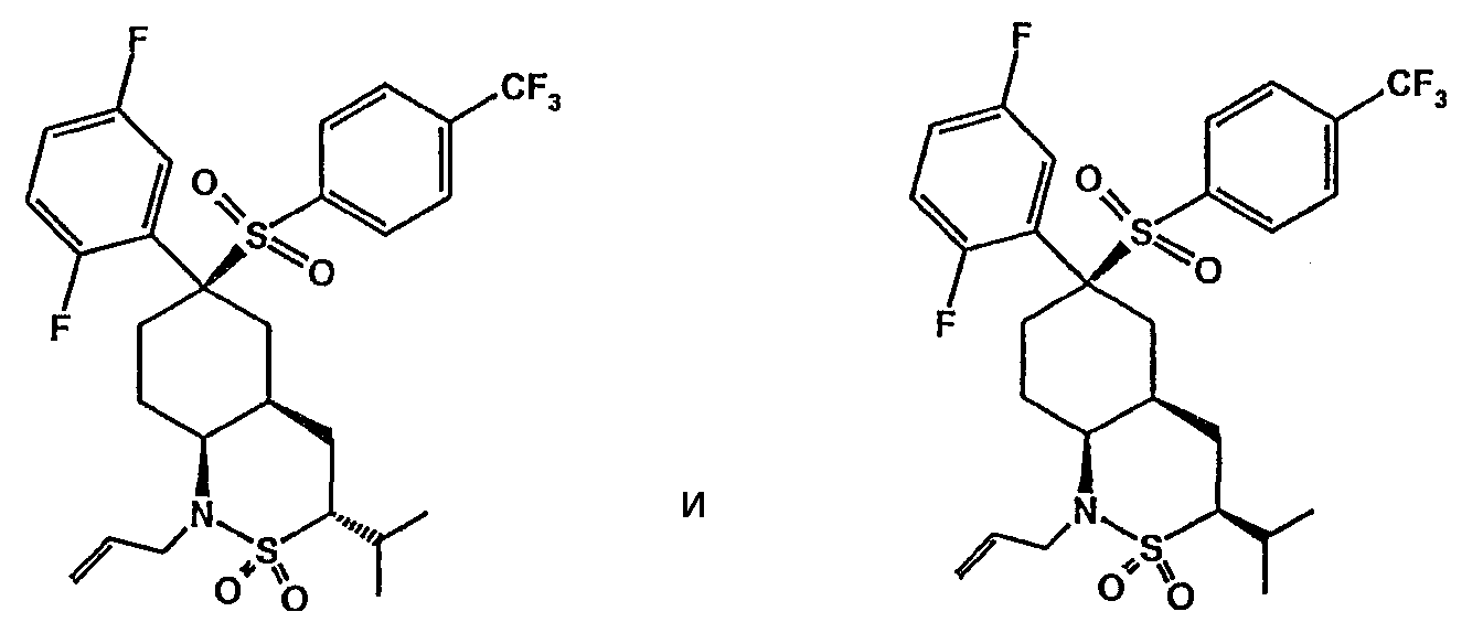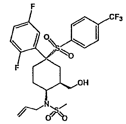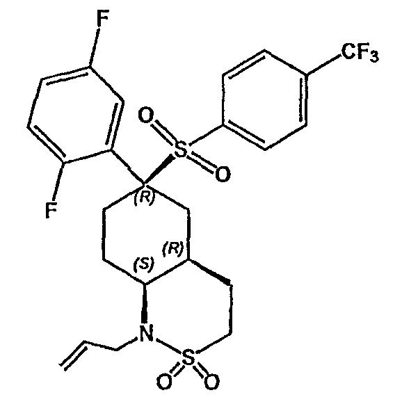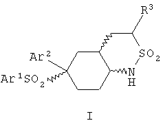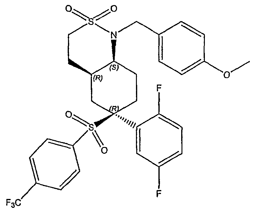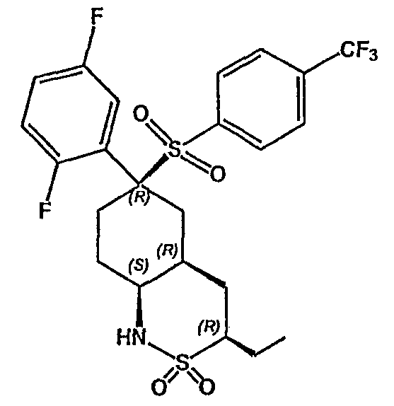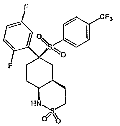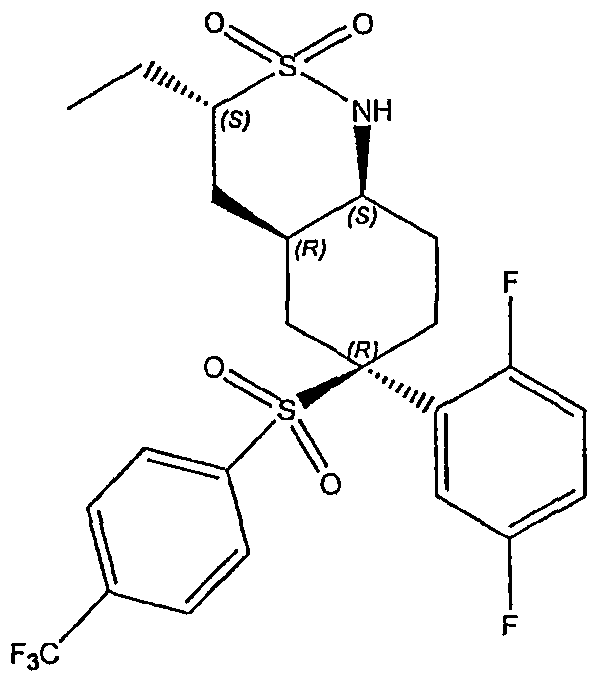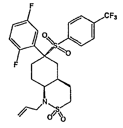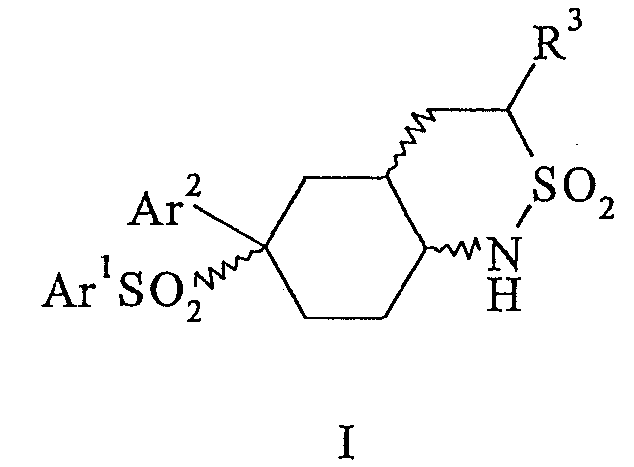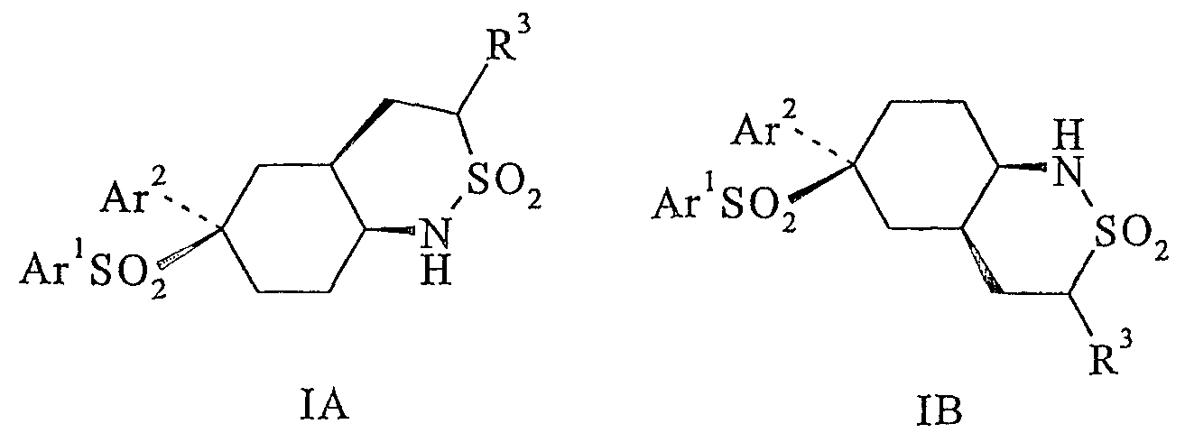 Настоящее изобретение относится к новому классу соединений, их солям, фармацевтическим композициям, включающим их, способам для их изготовления и их применению при лечении организма человека. В частности, изобретение относится к новым циклогексилсульфонам, включающим дополнительную конденсированную кольцевую циклическую сульфонамидную группу. Соединения ингибируют процессинг АРР Болезнь Альцгеймера (AD) представляет собой наиболее распространенную форму деменции. Хотя AD в первую очередь является заболеванием лиц пожилого возраста, поражающим до 10% населения в возрасте старше 65 лет, она также поражает значительные количества более молодых пациентов с генетической предрасположенностью. Она представляет собой нейродегенеративное расстройство, клинически характеризуемое прогрессирующей потерей памяти и познавательной функции, и патоморфологически характеризуется отложением внеклеточных белковых бляшек в корковых и ассоциативных областях мозга лиц, страдающих этим заболеванием. Эти бляшки главным образом включают фибриллярные агрегаты Имеется все большее количество сообщений в литературе о соединениях с ингибиторной активностью в отношении В документе WO 00/50391 раскрыт широкий класс сульфонамидов в качестве модуляторов продуцирования Настоящее изобретение предоставляет новый класс циклогексилсульфонов, включающих дополнительное конденсированное кольцо, которое содержит сульфонамидную группу. Соединения ингибируют процессинг АРР предполагаемой В соответствии с изобретением предоставляется соединение формулы I: где связи, указанные волнистыми линиями, представляют собой взаимно цис- в отношении циклогексанового кольца; R3 представляет Н или углеводородную группу, имеющую до 10 атомов углерода, необязательно замещенную CF3, CHF2, галогеном, CN, OR5, COR5, CO2R5, OCOR6, N(R5)2, CON(R5)2, или NR5COR6; R5 представляет Н или С1-4алкил; R6 представляет С1-4алкил; и Ar1 и Ar2 независимо представляют фенил или гетероарил, любой из которых несет 0-3 заместителя, независимо выбранных из галогена, CN, NO2, CF3, CHF2, OH, OCF3, CHO, CH=NOH, С1-4алкокси, С1-4алкоксикарбонила, С2-6ацила, С2-6алкенила и С1-4алкила, который необязательно несет заместитель, выбранный из галогена, CN, NO2, CF3, OH и С1-4алкокси; или его фармацевтически приемлемую соль. В формуле I и других формулах, представленных в настоящем описании, используется условное обозначение, посредством которого показывают, что волнистые линии обозначают связи, которые представляют собой взаимно цис- в отношении циклогексанового кольца. Все такие связи или выступают кверху от кольца, или выступают книзу от кольца. Сигма связи, присоединенные к циклогексановому кольцу и представленные сплошной линией, обязательно имеют ориентацию, противоположную ориентации связей, представленных волнистыми линиями. Соединения формулы I существуют в двух энантиомерных формах, в зависимости от того, выступают ли связи, указанные волнистыми линиями, кверху или книзу, соответствующие формулам IA и IB: где R3, Ar1 и Ar2 имеют такие же значения, как указано выше. Следует понимать, что любое соединение в соответствии с изобретением может существовать или в гомохиральных формах IA и IB, или в виде смеси обоих в любой пропорции. В дополнение к описанному выше изомеризму, соединения в соответствии с изобретением могут включать один или более асимметричных 