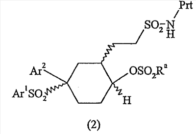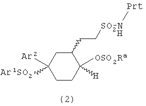 где связи, указанные волнистыми линиями, представляют собой взаимно цис- в отношении циклогексанового кольца; R3 представляет Н или углеводородную группу, имеющую до 10 атомов углерода; Ar1 и Ar2 независимо представляют фенил, который несет 0-3 заместителя, независимо выбранных из галогена, CF3, CHF2; или его фармацевтически приемлемой соли. Также изобретение относится к способу получения соединений общей формулы I и к фармацевтической композиции на основе соединения общей формулы I, которую применяют в качестве ингибитора гамма-секретазы. Технический результат: получены новые производные циклических сульфонамидов, обладающих ингибирующей активностью в отношении гамма-секретазы и пригодных для лечения и профилактики болезни Альцгеймера. 4 н. и 5 з.п. ф-лы.