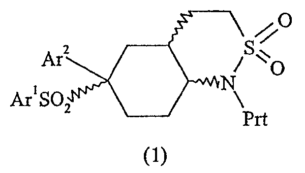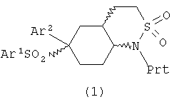 R3 представляет Н или углеводородную группу, имеющую до 10 атомов углерода; Ar1 и Ar2 независимо представляют фенил, который несет 0-3 заместителя, независимо выбранных из галогена, CF3, CHF2, или его фармацевтически приемлемая соль. 3. Соединение по п.1 или 2, где Ar1 представляет собой 4-хлорфенил или 4-трифторметилфенил, а Ar2 представляет собой 2,5-дифторфенил. 4. Соединение по по п.1 или 2, где R3 представляет Н или углеводородную группу, имеющую до 6 атомов углерода. 5. Соединение по п.4, где R3 представляет Н, метил, этил, н-пропил, изопропил или аллил. 6. Соединение по п.5, выбранное из 2,2-диоксида (4аRS,6RS,8аSR)-6-(2,5-дифторфенил)-6-{[4-(трифтор-метил)фенил]сульфонил}октагидро-1Н-2,1-бензотиазина; 2,2-диоксида (3S,4аR,6R,8аS)-6-(2,5-дифторфенил)-3-этил-6-{[4-(трифторметил)фенил]сульфонил}октагидро-1Н-2,1-бензотиазина; 2,2-диоксида (3R,4аR,6R,8аS)-6-(2,5-дифторфенил)-3-этил-6-{[4-(трифторметил)фенил]сульфонил}октагидро-1Н-2,1-бензотиазина; 2,2-диоксида (3RS,4аRS,6RS,8аSR)-6-(2,5-дифторфенил)-3-изопропил-6-{[4-(трифторметил)фенил]сульфонил}октагидро-1Н-2,1-бензотиазина; 2,2-диоксида (3SR,4аRS,6RS,8аSR)-6-(2,5-дифторфенил)-3-изопропил-6-{[4-(трифторметил)фенил]сульфонил}октагидро-1Н-2,1-бензотиазина и 2,2-диоксида (3S,4aR,6R,8aS)-6-[(4-(хлорфенил)сульфонил]-6-(2,5-дифторфенил)-3-этилоктагидро-1Н-2,1-бензотиазина; и их фармацевтически приемлемых солей. 7. Фармацевтическая композиция для применения в качестве ингибитора гамма-секретазы, включающая соединение по любому из пп.1-6 и фармацевтически приемлемый носитель. 8. Применение соединения по любому из пп.1-6 для изготовления лекарственного средства для лечения или профилактики болезни Альцгеймера. 9. Способ получения соединения формулы I, определенной в п.1, включающий стадии: (а) циклизацию соединения формулы (2)