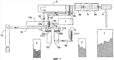 Более подробно в варианте осуществления изобретения, показанном на фиг.1, сухая фракция муниципальных твердых отходов, разгружается с автомобилей в соответствующую зону хранения (1). Механический покрытый резиной погрузчик (на фиг. не показан) отбирает сухую фракцию муниципальных твердых отходов из зоны хранения (1) и выгружает ее в загрузочную воронку, находящуюся над транспортером (4). Сухая фракция муниципальных твердых отходов подвергается первичной сортировке в магнитном разделителе (5а) для удаления всех содержащих железо материалов. Затем сухая фракция может быть направлена на ленту сортировочного транспортера (6), где путем ручной сортировки могут быть удалены все нежелательные отходы, например камни и другие инертные материалы, которые, возможно, случайно попадают в муниципальные твердые отходы и могут вызвать повреждение оборудования, используемого на последующих стадиях. При дальнейшей сортировке с использованием магнитного разделителя (5b) могут быть удалены любые оставшиеся содержащие железо материалы.