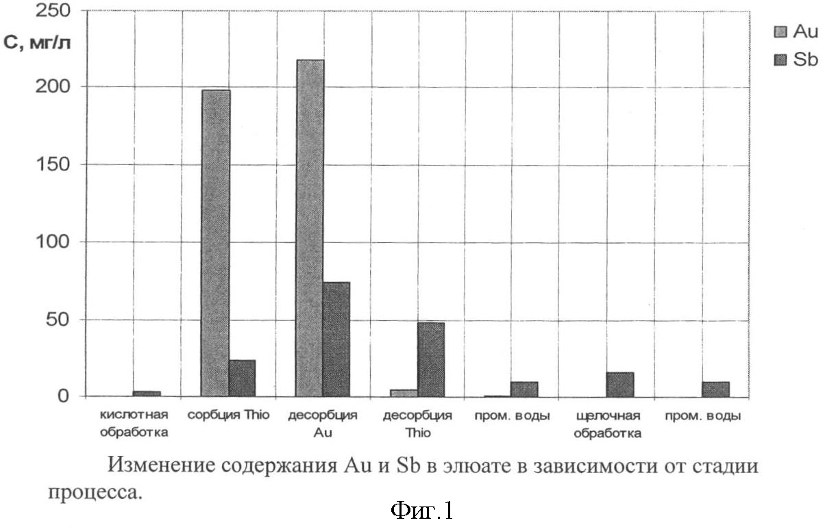 Фиг.1 – показано изменение содержания Au и Sb в сернокислом растворе тиомочевины (элюате) в зависимости от стадии процесса.
