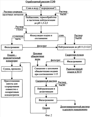Поставленная задача решается с достижением вышеуказанного технического результата предлагаемым “Способом комплексной переработки и дезактивации радиоактивных отходов редкометального производства”, включающим гидроразмыв отработанного расплава солевого оросительного фильтра (СОФ) процесса хлорирования лопаритовых концентратов, обработку образующейся суспензии щелочным реагентом, смешение с железосодержащими цеховыми обмывочными водами, отделение радиоактивного осадка от маточного раствора и транспортировку радиоактивного осадка в хранилище спецотходов (ХСО), отличающимся тем, что перед обработкой щелочным реагентом суспензию, получаемую после гидроразмыва отработанного расплава СОФ, смешивают в соотношении 1:(0,8-1,2) с раствором, содержащим 250-300 г/дм3 хлоридов щелочных металлов, и нагревают до 85±5°С, обработку суспензии с использованием в качестве щелочного реагента раствора гидроксида натрия ведут до рН 2,0±0,5, выдерживают при перемешивании в течении 0,5±0,1 часа, вводят 0,1-0,3% раствор высокомолекулярного флокулянта – гидролизованного полиакриламида, и выдерживают без перемешивания в течение 2,0±0,5 часа, после чего сгущенную часть суспензии подают на нутч-фильтр, полученный осадок – редкометальный концентрат – сушат, прокаливают и направляют на хлорирование исходных лопаритовых концентратов, а фильтрат объединяют с осветленной частью суспензии, нагревают до 80±10°С и обрабатывают раствором гидроксида натрия до рН 12,0±0,5, полученную оксигидратную пульпу выдерживают при 80±10°С в течение 1,0±0,5 часа и подают на фильтр-пресс-I, выделенный радиоактивный осадок промывают на фильтр-прессе-I 3-4 объемами воды, промводы объединяют с цеховыми обмывочными водами, и промытый осадок на фильтр-прессе-I продувают сжатым воздухом, выгружают и вывозят в ХСО, а маточный раствор смешивают в соотношении 1:(10-20) с железосодержащими цеховыми обмывочными водами, полученный радиоактивный хлоридный раствор нагревают до 80±10°С и обрабатывают раствором гидроксида натрия до рН 12,0±0,5, полученную при этом пульпу выдерживают при 80±10°С и закачивают на фильтр-пресс-II с получением дезактивированного раствора, который сбрасывают в цеховую канализацию, и осадка, который объединяют с осадком – редкометальным концентратом, выделенным из суспензии после растворения отработанного расплава СОФ, подвергают его термообработке и частичной нейтрализации, сушат, прокаливают и направляют совместно с исходным лопаритовым концентратом на хлорирование в солевых хлораторах.