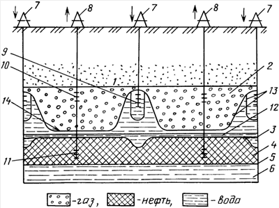 Нефтегазовую залежь с кровлей 1, газовой шапкой 2, газонефтяным контактом ГНК 3, нефтяной оторочкой 4, водонефтяным контактом (ВНК) 5 и подошвенной водонасыщенной зоной 6 разбуривают нагнетательными 7 и добывающими 8 скважинами. Интервалы вскрытия 9 нагнетательных скважин размещают непосредственно под непроницаемой кровлей 1. Добывающие скважины 8 снабжают интервалами вскрытия 10 в газовой шапке 2 и интервалами вскрытия 11 в нефтяной оторочке 4.