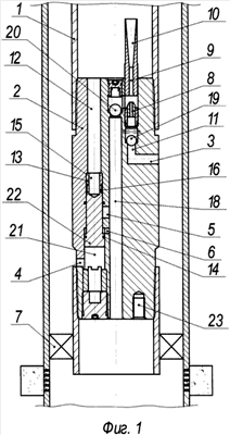 Под действием гидростатического давления обратный клапан 20 закрывается, а запорный элемент 13 удерживается в закрытом состоянии под действием большей силы со стороны нижней поверхности запорного элемента 13 не только за счет дифференциальной его конструкции, но и, дополнительно, за счет созданного перепада давления между нижней поверхностью запорного элемента 13, на которую действует гидростатическое давление, и поверхностью кольцевого уступа большей ступени 22 запорного элемента 13, на которую действует сниженное подпакерное давление благодаря соединению через радиальный канал 6 с продольным каналом 18.