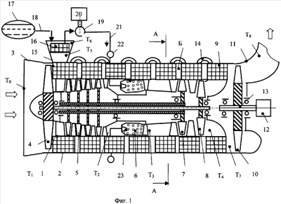 Предложенное техническое решение (фиг.1) содержит корпус первого контура 1, корпус второго контура 2, установленный концентрично ему с образованием второго контура, полость «Б». Последовательно по потоку установлены входное устройство 3, вентилятор 4, компрессор 5, камеру сгорания 6 и турбину высокого давления 7, турбину низкого давления 8. Вентилятор 4 соединен механически валом с турбиной высокого давления 7, а компрессор 5 соединен другим валом с турбиной низкого давления 8. Далее по потоку (по второму контуру) идет теплообменник 9, свободная воздушная турбина 10 и выхлопное воздушное устройство 11.