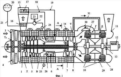 Предложенное техническое решение (фиг.1) содержит корпус первого контура 1, корпус второго контура 2, установленный концентрично ему с образованием второго контура, полость «В». Последовательно по потоку установлены: входное устройство 3, вентилятор 4, компрессор 5, камера сгорания 6, турбина высокого давления 7 и турбина низкого давления 8. Вентилятор 4 соединен механически валом с турбиной высокого давления 7, а компрессор 5 соединен другим валом с турбиной низкого давления 8. Далее по потоку по второму контуру идет теплообменник 9, двигатель Стирлинга 10 и выхлопное воздушное устройство 11.