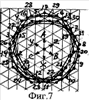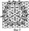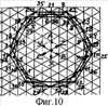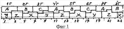 На фиг.1 показана развертка пазовых слоев предлагаемой обмотки при с=1 и 2р=16, z=69 с группами 1Г…24Г (пронумерованы сверху) для z’=z/3=23 пазов с номерами 1…23 снизу, чередованиями фазных зон в последовательности А-В-С, X-Y-Z в верхнем и нижнем слое; на фиг.2 показана диаграмма сдвигов осей для групп зон А относительно осей симметрии 4Г и 8Г; на фиг.3 и 4 по треугольной сетке при ее стороне в единицу длины построены многоугольники МДС обмотки фиг.1 при х=0 фиг.3, х=0,5 фиг.4. На фиг.5, 6, 7 показано то же, что и на фиг.1, 3, 4, но при z=93 для z’=z/3=31, где зачерненные пазы имеют неполное заполнение при эквивалентных zэ=3(N-х) полностью заполненных пазах. На фиг.8, 9, 10 – то же, что и на фиг.1, 3, 4, но при z=117 для z’=z/3=39. Такие m’=3-зонные обмотки по фиг.1, 5, 8 соединяются при последовательно-согласном включении групп зон А, В, С в фазах I, II, III, а фазы могут сопрягаться в Y или : при, например, с=2 обмотки имеют 2р=32 полюса при z=138, 186, 234 пазах.