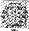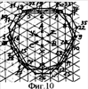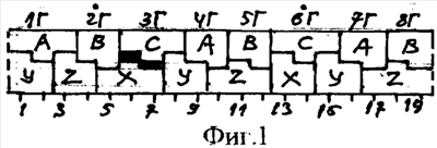 На фиг.1 показана развертка пазовых слоев предлагаемой обмотки при с=1 и 2р=16, z=57 с группами 1Г…24Г (пронумерованы сверху) для z’=z/3=19 пазов с номерами 1…19 снизу, чередованиями фазных зон в последовательности А-В-С, X-Y-Z в верхнем и нижнем слое и зачерненные пазы имеют неполное заполнение при эквивалентных zэ=3(N-x) полностью заполненных пазах; на фиг.2 показана диаграмма сдвигов осей групп зон А относительно осей симметрии 10Г и 22Г; на фиг.3 и 4 по треугольной сетке при ее стороне в единицу длины построены многоугольники МДС обмотки фиг.1 при х=0 фиг.3, х=0,5 фиг.4. На фиг.5, 6, 7 показано то же, что и на фиг.1, 3, 4, но при z=81 для z’=z/3=27. На фиг.8, 9, 10 – то же, что и на фиг.1, 3, 4, но при z=105 для z’=z/3=35. Такие m’=3-зонные обмотки по фиг.1, 5, 8 соединяются при последовательно-согласном включении групп зон А, В, С в фазах I, II, III, а фазы могут сопрягаться в Y или ; при, например, с=2 обмотки имеют 2p=32 полюса при z=114, 162, 210 пазах.