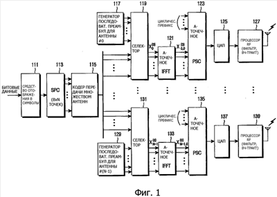 Фиг.1 – блок-схема, показывающая передатчик, использующий N передающих антенн в системе связи OFDM в соответствии с вариантом осуществления настоящего изобретения. На фиг.1 передатчик включает в себя средство 111 отображения в символы, последовательно-параллельный преобразователь 113 (SPC) (ППП), кодер 115 многоантенной передачи, N генераторов 117, 129 последовательностей преамбул, N селекторов 119, 131, N процессоров 121, 133 IFFT, N параллельно-последовательных преобразователей (PSCs) (ППП) 123, 135, N цифро-аналоговых преобразователей (DACs) (ЦАП) 125, 137 и N RF (РЧ; радиочастотных) процессоров 127, 139.