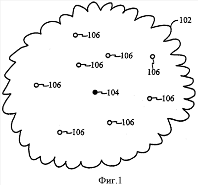 Фиг.1 иллюстрирует возможный вариант топологии сети для пикосети в системе радиосвязи. Пикосеть 102 изображена с главным терминалом 104, поддерживающим связь между несколькими терминалами-членами 106. Терминалы могут быть стационарными или в движении, например терминалом, который несет пользователь, когда идет пешком, или в транспортном средстве, самолете, корабле или подобном. Термин “терминал” предназначен для охвата любого вида устройства мобильной связи, включая сотовые телефоны или радиотелефоны, персональные ассистенты данных (PDA), портативные компьютеры, внешние или внутренние модемы, PC-платы или любые другие подобные устройства. Внутри пикосети 102 главный терминал 104 может быть выполнен с возможностью осуществления связи с каждым из терминалов-членов 106. Терминалы-члены 106 могут быть также выполнены с возможностью осуществления прямой связи друг с другом под управлением главного терминала 104. Как более подробно поясняется ниже, каждый терминал-член 106 в пикосети 102 может быть также выполнен с возможностью осуществления прямой связи с терминалами за пределами пикосети. Главный терминал 104 может осуществлять связь с терминалами-членами 106 с использованием схемы множественного доступа, такой как TDMA, FDMA, CDMA или другой схемы множественного доступа. Для иллюстрации различных аспектов настоящего изобретения, сети радиосвязи, описанные в этом раскрытии, будут рассмотрены в контексте гибридной схемы множественного доступа, применяющей технологии и TDMA и CDMA. Для специалистов в данной области техники очевидно, что настоящее изобретение никоим образом не ограничено такими схемами множественного доступа.