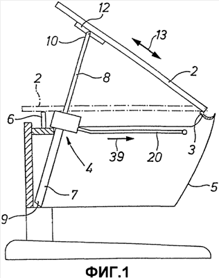 С тем чтобы иметь возможность смещать опорный элемент 8 и таким образом изменять угловое положение рабочей панели 2, необходимо уменьшить или соответственно устранить перекос между зажимным элементом 14 и опорным элементом 8. Это происходит автоматически, когда опорный элемент 8 выдвигается из направляющего элемента 7 при повороте вверх рабочей панели 2. Уже при небольшом увеличении (перемещении) зажимного элемента 14 в направлении выдвижения, когда он поворачивается вверх вокруг опорной точки 16, видимая в продольном направлении опорного элемента 8 проекция сквозного отверстия 15 увеличивается настолько, что опорный элемент 8 может перемещаться практически беспрепятственно. Если опорный элемент 8 напротив должен вдвигаться в направляющий элемент 7, то перекос уменьшается за счет приводимого в действие пользователем исполнительного элемента 17, с помощью которого зажимной элемент 14 поворачивается вокруг опорной точки 16. При этом, бездействовавший до сих пор при не приведенном в действие исполнительном стержне 20 исполнительный элемент 21 воздействует на зажимной элемент 14 и поворачивает его для уменьшения перекоса.