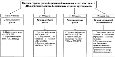 При отсутствии данных по одному из параметров его балльную оценку приравнивают к «0». Полученные данные суммируют, и если сумма баллов составила менее «30», то прогноз течения и исхода беременности благоприятный, в этом случае дальнейшее наблюдение за гестационным периодом и родоразрешение осуществляется в учреждениях родовспоможения Центральной районной или городской больницы (ЦРБ, ЦГБ), информация о женщине передается в прикрепленный Межрайонный перинатальный центр (МПЦ) или Городской родильный дом (ГРД). Если сумма баллов составила от «31» до «49», то прогноз исхода сомнительный, в этом случае информация из ЦРБ, ЦГБ или ГРД передается в прикрепленный МПЦ или ГРД, осуществляется консультация в МПЦ или ГРД, где определяется тактика дальнейшего ведения беременности и родоразрешения, ставится в известность Республиканский перинатальный центр (РПЦ) или Областной, Краевой родильный дом (ОРД, КРД). В случае если значение суммы баллов находится в промежутке от «51» до «99», то прогноз исхода неблагоприятный, информация из ЦРБ или ЦГБ передается непосредственно в РПЦ или ОРД, КРД, где осуществляется консультация беременной женщины, определяется тактика и уровень стационара дальнейшего ведения гестационного периода и родоразрешения. Если сумма баллов составила «101» балл и выше, прогноз крайне неблагоприятный. Осуществляется экстренная госпитализация в ближайшее учреждение родовспоможения, проводится интенсивная терапия имеющейся патологии. Кроме того, экстренное извещение Акушерско-гинекологического-реанимационного консультативного центра (Санитарная авиация), решается вопрос о вызове специализированной бригады «на себя» и возможности пролонгирования беременности, сроке, методе, стационаре родоразрешения или прерывания гестационного периода.
