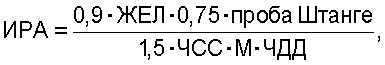 где ИРА – индекс респираторной адаптации; ЖЕЛ – жизненная емкость легких (мл); Проба Штанге – задержка дыхания на высоте вдоха (с); М – масса тела в кг; ЧСС – частота сердечных сокращений в 1 мин; ЧДД – число дыхательных движений в 1 мин, и при значении ИРА менее 0,17 единиц прогнозируют неблагоприятный исход заболевания.