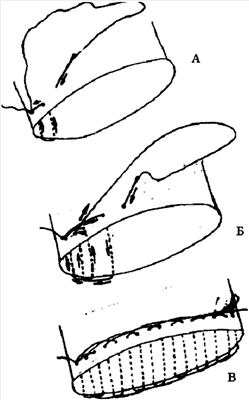 На чертеже представлена схема этапов наложения непрерывного возвратно-обвивного шва с перехлестом при резекции печения, где: поз. А – отступив на 2 см от границы резекции, иглу перпендикулярно вкололи в диафрагмальную поверхность печени и провели с нитью через всю толщу паренхимы, выколов на висцеральной поверхности, вытянув нить до тех пор, пока у точки первого вкола на диафрагмальной поверхности останется лишь ее конец длиной 6-7 см. Далее, отступив от точки выкола на 1,5-2 см продольно оси резекции, эту же иглу перпендикулярно вкалывают в висцеральную поверхность с проведением нити через толщу паренхимы и выколом на диафрагмальной поверхности с последующим затягиванием и узлообразованием ведущей нити с ее хвостовым отрезком. Поз. Б – отступив от предыдущей точки выкола вдоль оси границы резекции на 1,5-2 см, делаем второй вкол перпендикулярно в диафрагмальную поверхность, проводим иглу с нитью через всю толщу паренхимы и выкалываем на висцеральной поверхности и, вытянув иглу с нитью, отступаем от точки выкола на 1 см в обратном направлении до середины длины предыдущей шовной петли, где производим вкол иглы перпендикулярно в висцеральную поверхность. Иглу выкалывают на диафрагмальной поверхности, на середине расстояния между точками ранее произведенных вкола и выкола, то есть в средней трети шовной петли. Вытянув лигатуру, проводят ее под шовной петлей и затягивают до плотной компрессии прошитых тканей. Поз. В – дальнейшее наложение непрерывного возвратно-обвивного шва с перехлестом производят точно такими же приемами до противоположного края печени в пределах границы ее резекции, где в конце шва затягивают нити и накладывают последний фиксирующий узел.