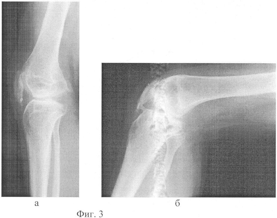 На контрольном осмотре через 6 месяцев больная ходит с полной нагрузкой на оперированную конечность без дополнительных средств опоры, движения в коленном суставе в пределах 165-90°, безболезненны (фиг.3а, б).