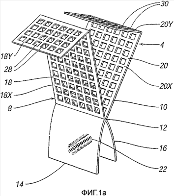 Каждый из указанных внутренних участков 18Х, 18У, 20Х, 20У снабжен множеством отверстий 28, 30, расположенных в форме решетки. Когда первый и второй удерживающие элементы 8, 10 находятся в закрытом положении, таким образом, что элементы являются параллельными или соприкасаются или, по меньшей мере, прилегают друг к другу, отверстия 28 на первом удерживающем элементе располагаются, по существу, на одной линии с отверстиями 30 на втором удерживающем элементе. Однако отверстия 28, 30 могут быть предоставлены не на одной линии при необходимости.