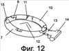 В коробке 1 размещен держатель 7 с удерживаемым презервативом 8, как показано на фиг.13. Держатель 7 презерватива (фиг.12) содержит разомкнутое полое кольцо 10 с фигурным пазом 11, который проходит по его внутренней окружности и в котором размещен презерватив 8, например традиционный презерватив, описанный выше. Большая часть презерватива 8 свернута в кольцо и в таком виде размещена в кольцевой полости кольца 10, за исключением конца презерватива 12, перекрывающего отверстие кольца 10. Плоскость, проходящая через экватор кольца, в которое свернут презерватив, в данном тексте называется плоскостью презерватива.