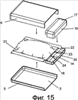Упаковка также содержит съемную крышку 16, закрывающую коробку 1 и прикрепленную к держателю 7. Съемная крышка 16 выполнена с одним открытым торцом из двух пластин 17 и 18, каждая из которых имеет с трех сторон бортик 19 и 20 соответственно. Планка 14 закреплена внутри крышки 16 или выполнена с ней за одно целое. В рассматриваемом варианте планка 14 и пластина 18 выполнены за одно целое, как показано на фиг.15.