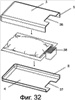 На фиг.31-32 представлен вариант выполнения изобретения, согласно которому коробка 1 выполнена с одним открытым концом 2 из двух частей 3 и 4 в виде пластин, по краю которых с трех сторон выполнены бортики 5 и 6 соответственно. Части 3 и 4 соединены между собой своими бортиками 5 и 6 наподобие частей мыльницы. На открытом конце 2 на противоположных сторонах выполнены вырезы 36 и 37.