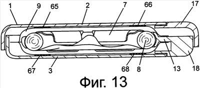 Пакет 9, в котором размещен держатель 7 с удерживаемым в нем презервативом, расположен в коробке 1, которая выполнена таким образом, что поверхности пакета 9, расположенные в плоскости презерватива, примыкают к внутренней поверхности частей 5 и 6 коробки. Пакет 9 прикреплен к частям 5 и 6 посредством связующего, например приклеен. Предпочтительное расположение клеевых участков 65, 66, 67 и 68 показано на фиг.13. Однако пакет может быть прикреплен и на более протяженных участках. Возможны также варианты, при которых пакет прикреплен только к одной части 5 или 6 коробки, например выполнены только клеевые участки 65 и 66 или только клеевые участки 67 и 68. Также могут быть выполнены только участки 66 и 68 (не показано).