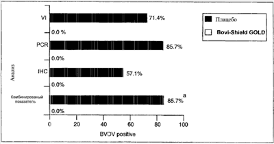В настоящем исследовании вакцинация бычков Bovi-Shield® GOLDTM 5 предотвращала хроническую инфекцию семенников вирусом BVD типа 1 и последующее выделение вируса в семени. Различие между животными, получавшими плацебо и вакцину, по меньшей мере, по одному положительному тесту, оцениваемое двухсторонним точным критерием Фишера, было статистически значимым (Р=0,0002).