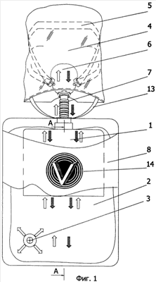 Выдыхаемый воздух, поступая в мешок выдоха, частично охлаждает воздух в мешке, чем обеспечивается теплосъем с поверхности аппарата, непосредственно прилегающей к пользователю. Выдыхаемый воздух в мешке выдоха проходит через патрон, регенерируется и поступает в мешок вдоха, где охлаждается за счет того, что мешок вдоха имеет достаточно большой объем и соответственно значительную поверхность контакта с окружающей средой. При этом отмечается, что, несмотря на большой объем дыхательного мешка, размещение регенеративного патрона внутри мешка позволяет не увеличивать габариты дыхательного аппарата в целом. Такой изолирующий дыхательный аппарат сложен по конструкции из-за необходимости герметизации регенеративного патрона в мешке выдоха и не удобен в эксплуатации из-за прилегания его разогретой части к телу пользователя, что ухудшает условия теплоотвода от его поверхности и может стать причиной ожога пользователя в месте прилегания мешка выдоха.