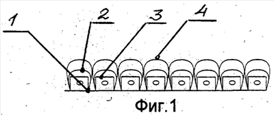 На фиг.1 представлена графическая запись переплетения трикотажного полотна 1, содержащая грунтовую нить, состоящую из нерастяжимой 2 и эластомерной 3 нитей и платировочной из синтетической нити 4.
