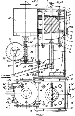 Вторая модификация устройства содержит (фиг.3): «игровой стержень» 1 с несколькими модификациями сменных рукояток 2, подсоединяемых к одному концу «игрового стержня» 1, другой конец которого выполнен в виде шара 3 и помещен в стакан 50, в котором образована среда регулируемого трения для шара 3, например, с помощью верхнего 51 и нижнего 52 трущихся элементов и стягивающего электромеханического узла, состоящего из верхней первой подвижной пластины 53 и нижней 54 неподвижной пластины, второй подвижной пластины 55, стягиваемых четырьмя тяговыми стержнями 10, 11, 12, 13 с крепежными гайками, стакана 50, выполненного в виде призмы с прямоугольным четырехугольником в поперечном сечении, четырех конусообразных пружин 14, 15, 16, 17 (14 и 16 показаны на фиг.3, 15 и 17 не показаны, но они надеты на тяговые стержни 11 и 13), размещенные между первой подвижной пластиной 53 и верхним 51 трущимся элементом на суммирующей пластине 56, штока 19 с крепежной гайкой, закрепленного по оси центральной симметрии устройства во второй подвижной пластине 55 равноудаленно от крепления в ней указанных тяговых стержней, рычага 20, закрепленного на 2 уголках 21 и 22, установленных на внутренней боковой стенке 50, и соединенный одним концом со штоком 19, а другим концом через прорезь 23 (см. фиг.2) в стенке стакана 50 и соединитебльную гибкую нерастяжимую нить 24 (см. фиг.3) – с валом 25 мини-ворота, образованного осью 25 (являющееся валом мини-ворота) шестерни 26, закрепленной на двух стойках 27 и 28 с применением, например, подшипников скольжения 29 и 30. Сама шестерня 26 соединена с червяком 31, образуя червячную зубчатую передачу, червяк 31 которой соединен с одной стороны с якорем 32 реверсивного электродвигателя постоянного тока 33 электропривода, установленного со смещением относительно оси центральной симметрии устройства (см. фиг 2), например, с помощью цангового зажима, а с другой стороны – на упорной стойке 34 с применением подшипника скольжения 35. В продолжении червяка 31 сделано сквозное отверстие 36, перпендикулярно оси червяка 31 датчика оборотов якоря 32 электродвигателя 33, оптического датчика 37 с согласующим и усилительным каскадом 38, сигнал с которого подается в системный блок через усилитель персонального компьютера. Кроме того, относительно рычага 20 установлены датчик его нулевого положения 39 и датчик его максимального хода 40. Сигнал с этих датчиков также подается в системный блок персонального компьютера. К стакану 50 в его верхней части прикрепляется оптическая «мышь» 57, сканирующая поверхность шара 3 через окно 58 в стенке стакана 50. От клавиш оптической «мыши» 57 сделаны электрические отводы, оканчивающиеся кнопками 42, 43, соответственно от левой и правой клавиши. Оптическая «мышь» 57 соединяется также с системным блоком персонального компьютера с помощью электрического кабеля 44. В верхнем 51 трущемся элементе, в верхней 53 подвижной пластине и суммирующей пластине 56 сделаны сквозные круговые отверстия для перемещения «игрового стержня» 1. Устройство крепится на основании 45 с помощью, например, винтов или шурупов 46, 47, 48, 49.