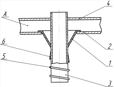 Контактирующая жидкая фаза поступает в полость А и конический распределитель 1. Равномерно распределяясь, жидкость, создает избыточное давление в полости А, тем самым вызывая деформацию свободно прилегающей к трубе 3 кромки эластичного распределителя 1. Образуется кольцевая щель, через которую выдавливается жидкость на поверхность трубы 3. Жидкость равномерно обтекает коническую вставку 6, спираль 5 и движется по наружной поверхности трубы 3, взаимодействуя с восходящим потоком пара (газа). Ширина щели, а следовательно, толщина и скорость выдавливаемой жидкости регулируется избыточным давлением, создаваемым внутри полости А, что способствует интенсификации тепломассообменного процесса. Для прекращения истечения жидкости необходимо снять избыточное давление жидкости, вследствие чего эластичный распределитель 1 под действием упругой деформации возвращается в первоначальное положение, щель перекрывается, и истечение прекращается. После прохождения рабочего объема контактирующие фазы выводятся из аппарата.
