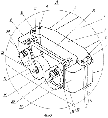 Это достоинство достигается тем, что подвеска ходовых колес содержит четырехзвенный шарнирный механизм. При этом появляется возможность минимизировать базу двухколесной приводной тележки и, следовательно, свести к минимуму момент сил бокового скольжения, действующих на ходовую часть при вращении моста.