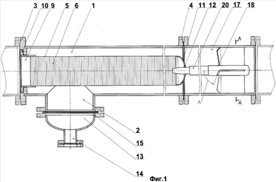 К присоединительному фланцу 4 присоединена камера завихрения 17 потока очищаемой среды в виде трубы с двумя фланцами на торцах, в которой установлен завихритель потока 18, представляющий собой лопасти 19, стационарно установленные в трубе камеры завихрения 17, угол наклона а принят равным 70°, лопасти 19 закреплены на центрирующем стержне 20, ступенчатой формы, один конец которого большего диаметра имеет обтекаемую форму, а другой конец меньшего диаметра с концом в виде усеченного конуса закреплен в центральном отверстии 12 обтекателя 11. Фильтр щелевой центробежный устанавливается в магистраль с очищаемой средой.
