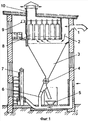 Загрязненный воздух поступает в фильтр двухступенчатый с пылеосадочной камерой для улавливания костры в короб 1 для входа запыленного воздуха, а очищенный выходит из короба 10. Бункерное устройство содержит демпферную камеру 2 для снижения скорости поступающего воздуха, а бункер 3, в котором происходит осаждение костры и крупной пыли, имеет затвор 4 и ящик 5 для сбора пыли. По трубам 6 и 7 пневмотранспортом отводится пыль на склад. Регенерация рукавных фильтров может осуществляться сжатым воздухом при движении по рукавам кольца с прорезью (фиг.2) или посредством эжекторной продувки (фиг.3).