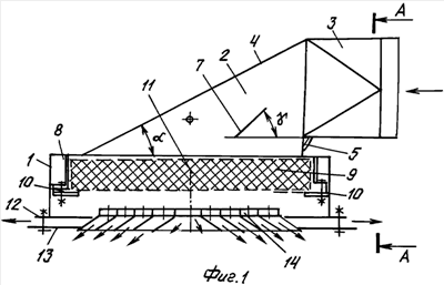 Данные технические решения позволили скомпенсировать аэродинамический удар в грязной полости 2, свести к минимуму турбулентные завихрения и эжекционный эффект (разрежение) в грязной полости 2, за ее передней стенкой 5. За счет указанных технических решений значительно снижено сопротивление воздушному потоку воздуха потолочной фильтр-камеры в грязной полости 2 и достигнута равномерность распределения воздушного потока по всей плоскости фильтрующего элемента 9.