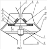 Высокое качество смеси в устройстве смешения достигается за счет совместной переработки сыпучих материалов при их взаимодействии с поверхностью отбойника и ребрами, движении в разреженном состоянии в виде факела и движении по поверхностям лопаток, перелетая с лопатки на лопатку через окна, а также при движении сквозь эластичные элементы, расположенные на поверхности конической насадки.