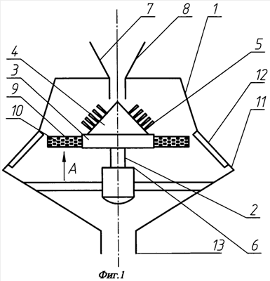 Подлежащие переработке сыпучие материалы подаются дозаторами 7 и 8 внутрь корпуса 1, на поверхность вращающейся конической насадки 4, где под действием центробежной силы движутся к ее основанию, взаимодействуя при этом с эластичными элементами 5. При движении материалов сквозь эластичные элементы происходит их смешение. Далее частицы материалов поступают на поверхность лопастей 9 и движутся по ним, проходят через окна 10 и попадают на поверхность следующей лопатки. С лопаток частицы срываются и ударяются о поверхность отбойника 11 с ребрами 12, направляются к устройству выгрузки 13.