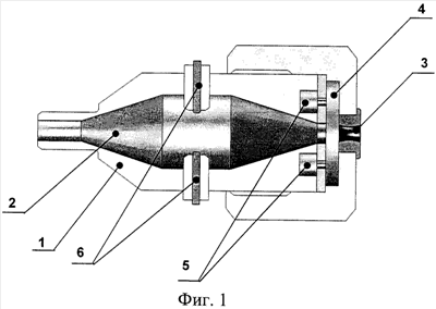 При течении воды во время действия импульса через акустическое сопло происходит взаимодействие водяной струи и звуковых колебаний, возбуждаемых в кольцевой камере 4 акустическими резонаторами 5. Вследствие этого взаимодействия струя после выхода из сопла 3 дробится на капли одинакового размера. Размер определяется параметрами акустических колебаний с диаметром капель от 10 до 150 мкм. Параметры акустических колебаний зависят от размеров кольцевой камеры 4 и резонаторов 5 и могут регулироваться за счет изменения их объема.