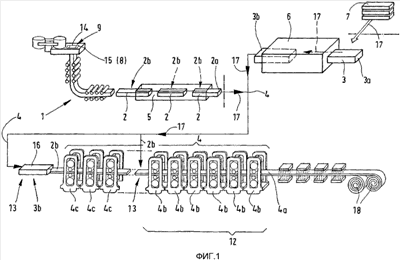 Тонкий сляб 2 и толстый сляб 3 из стали после разливки на установке 1 непрерывного литья прокатываются в линии 4 прокатного стана в горячекатаную полосу 4a и наматываются в рулоны 18. Для тепловой подготовки процесса прокатки тонкий сляб 2 и толстый сляб 3 после непрерывной разливки выравниваются по температуре в туннельной печи 5 или печи 6 с шагающими балками и нагреваются до температуры прохода в первой прокатной клети 4b или 4c и передаются после этого в линию 4 прокатного стана.