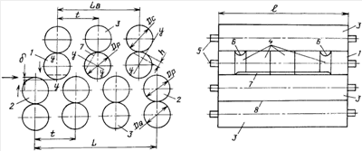 Машина содержит рабочие верхние 1 и нижние 2 ролики, установленные с шагом t и заданной величиной перекрытия в вертикальной плоскости. Рабочие ролики опираются на опорные ролики 3 большего диаметра. Верхние рабочие ролики выполнены с бочками, состоящими из отдельных дисков 4 требуемой конфигурации, установленных на осях 5; собранная бочка этих роликов содержит радиальные проточки 6 и плоские срезы 7. Бочки 8 нижних роликов – гладкие цилиндрические, устанавливаемые также на осях 5, причем эти бочки могут быть цельными. Наружный диаметр всех рабочих роликов равен Dp, опорных – Do и Do>Dp, а глубина h проточек и срезов не превышает 0,14 Dp; длина бочек – l.