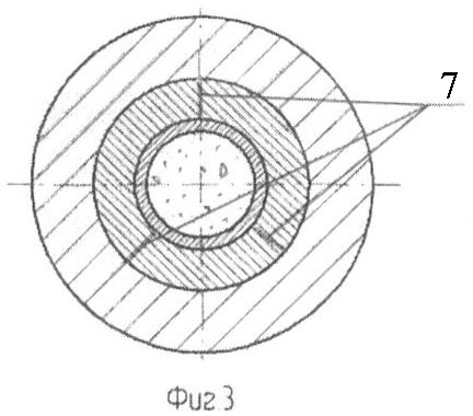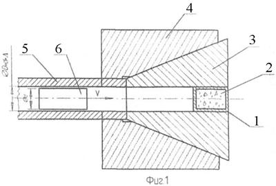 Пуансон 6 диаметром dп=27,5 мм и длиной Lп=250 мм устанавливается в разгонный отсек 5 с внутренним диаметром dp.o=28 мм. Диаметр отверстия в матрице 3 dм=28 мм. Для обеспечения движения пуансона 6 без помех по отверстиям разгонного отсека 5 и матрицы 3 разница в размерах диаметров составляет 0,5 мм. Разгоняют пуансон до скорости V=1000 мм/с, продуктами взрыва ВВ (можно осуществлять разгон, например, сжатым газом, пороховыми газами или любым иным способом, при этом изменяется скорость разгона), который долетает до контейнера 1 с порошком 2 (Lк=50 мм), и за счет части кинетической энергии летящего пуансона 6 происходит обжатие порошка 2 вместе с контейнером 1. При этом часть кинетической энергии расходуется на деформацию контейнера 1, часть – на деформацию летящего пуансона 6 и часть – на трение пуансона 6 по матрице 4 после деформации пуансона 6 под действием инерционных сил в процессе воздействия с контейнером 1. Диаметр летящего пуансона 6 dп выбирается из условий движения его в разгонном отсеке с минимальным трением. Длина пуансона выбирается из условия обеспечения необходимой массы, а масса пуансона 6 и скорость его движения до удара – из условия обеспечения необходимого давления прессования. Длина отверстия в матрице L=600 мм должна быть больше суммарной длины летящего пуансона и находящегося в матрице прессуемого материала.