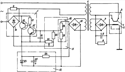 Регулирующий элемент 1 представляет собой составной транзистор 15, 16, включенный в цепь переменного тока через диодный мост 14. Резистор 17 подключен между базой и эмиттером первого транзистора 16.